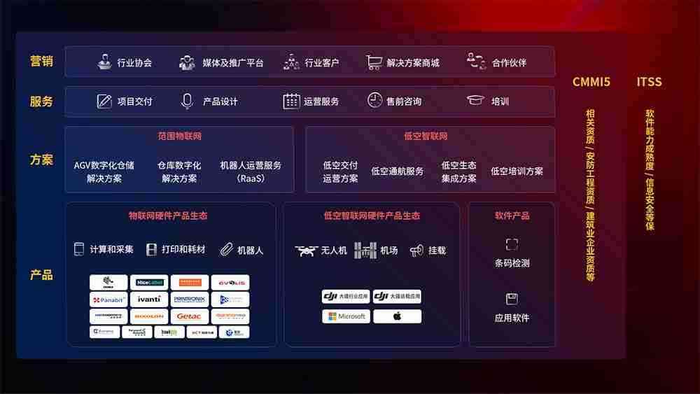 聚合国内外先进的物联网硬件产品品牌,,聚焦数字化仓储、、机器人运营、、、、低空智联网等领域,,,共同打造适合客户业务场景的解决方案并提供交付服务