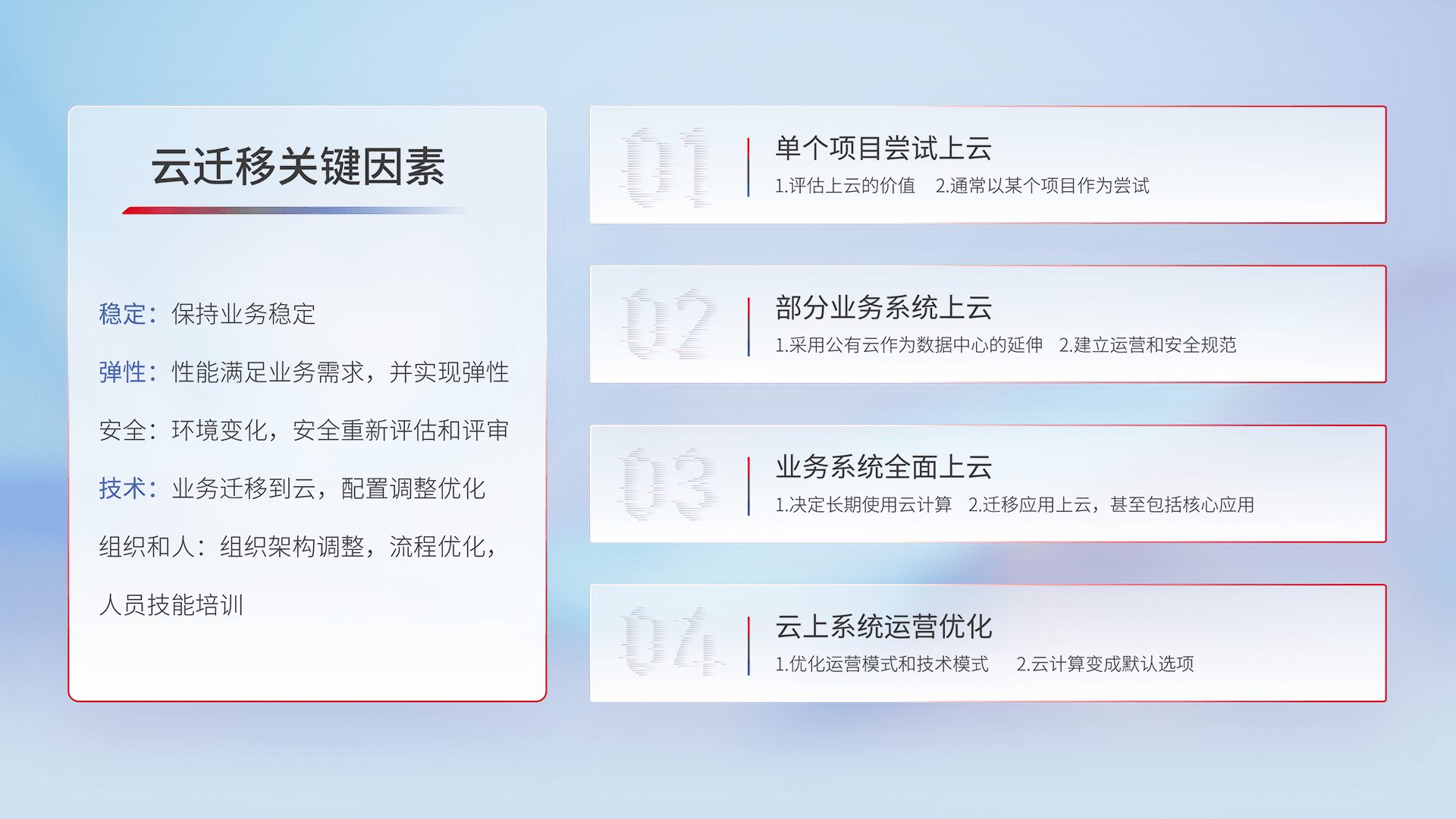 结合实际业务,,,从规划设计、、、、云平台选型、、云原生改造、、、、数据迁移、、、集成交付,,,迁移全过程为客户识别最佳上云路径,,,,做好风险识别管理,,设计网络架构、、、、身份权限、、、安全审计合规、、操作审计、、日志审计、、、、监控告警策略、、多站点容灾设计等,,对云上基础设施进行整体规划,,提升IT治理水平,,,以满足弹性、、、高可用、、、、高性能的需求。。。
